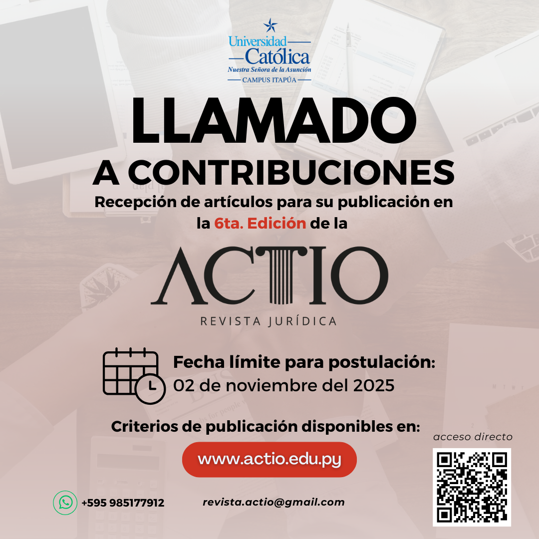 La Revista Jurídica Actio es patrocinada por la Facultad de Ciencias Jurídicas de la Universidad Católica "Nuestra Señora de la Asunción" Campus Itapúa.